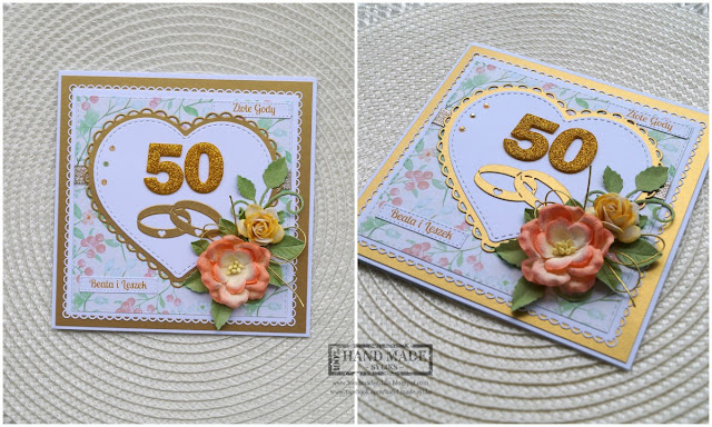 Kartki ślubne zazwyczaj występują w pastelowych kolorach, tworząc tą kartkę chciałam ten stereotyp trochę złamać, stąd butelkowa zieleń jako baza i złote dodatki ;)
